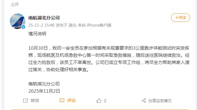 11月2日,接近南航的知情人士告诉记者,10月30日上午,南航湖北分公司空保管理部组织航空安全员进行年度DT(日常训练签注)考核。9时08分左右,一名男性队员在3000米考核过程中突发身体不适。现场航医立即实施急救,并拨打120求助。